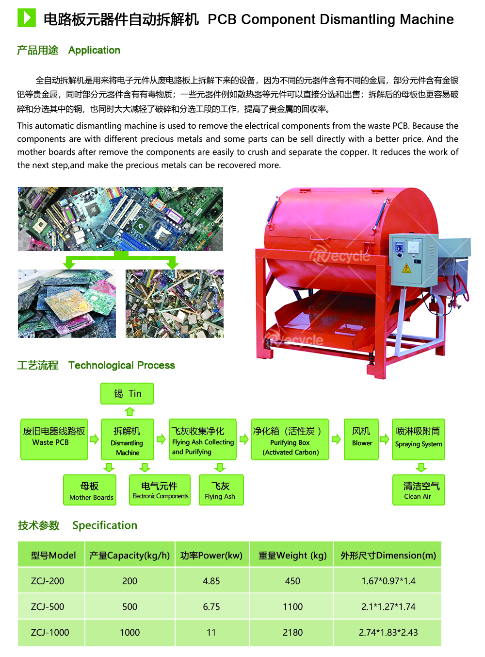 全自动拆解机是用来将电子元件从废电路板上拆解下来的设备,因为不同的元器件含有不同的金属,部分元件含有金银钯等贵金属,同时部分元器件含有有毒物质;一些元器件例如散热器等元件可以直接分选和出售;拆解后的母板也更容易破碎和分选其中的铜,也同时大大减轻了破碎和分选工段的工作,提高了贵金属的回收率。