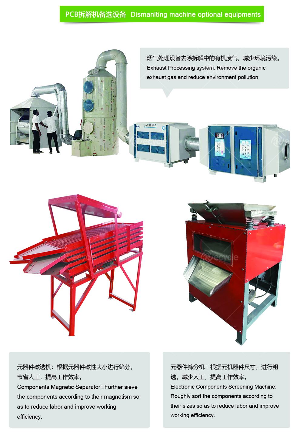 电路板拆解设备,废旧电路板元器件分离设备,将各种废旧电路板,手机电路板等,破碎分选提炼设备,操作简单.电路板元器件需要先拆解处置,焊锡分离后,后续的光板处理可采用气流比重分选设备,达到金属和非金属分离。