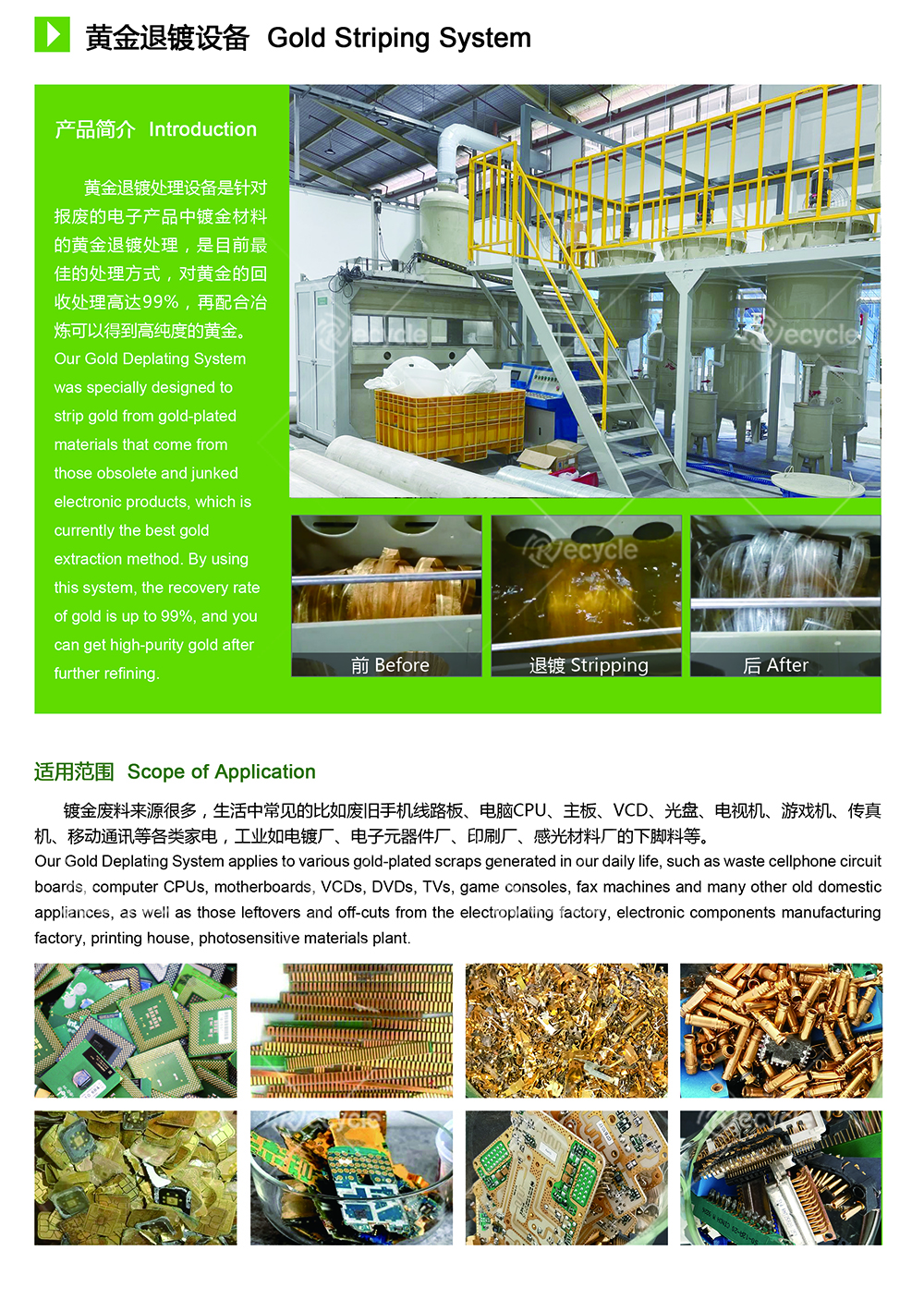 电路板黄金退镀设备简介:退镀技术是电路板拆解与贵金属回收中的关键步骤。它利用化学或物理方法,将电路板上的金属镀层从基材上分离出来。这一过程中,退镀设备发挥着至关重要的作用。除了常见的电路板物料外,其他贵金属含量的材料也可以通过退镀设备来实现贵金属的提炼。