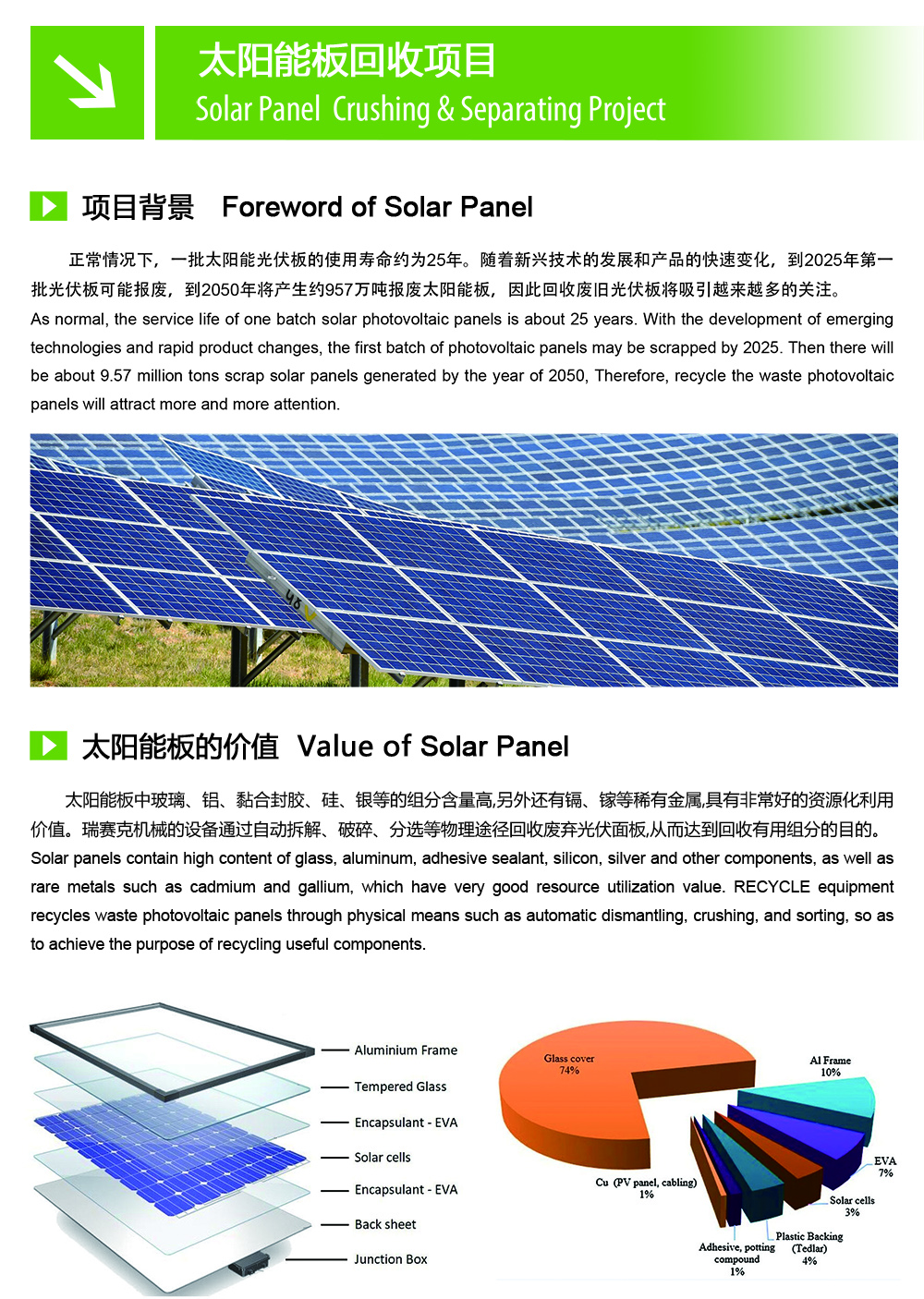 光伏板回收处理设备线的过程由机械臂抓取进入全自动生产线,仅1分钟便完成拆解,接线盒、铝框、EVA胶及背板、焊带、玻璃、电池片等同步实现分类收集。报废光伏组件等废弃物的回收处置与利用成为一个新兴的产业。光伏组件材料包含玻璃、硅、银、铜、铝等有价值组分,大部分物质通过适当回收,实现循环再利用,可有效缓解生态环境压力、降低光伏全产业链能耗等指标、节约硅和有价金属等资源。