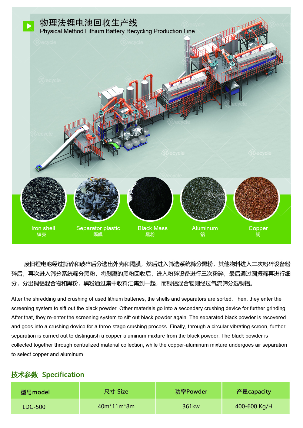 废旧锂电池破碎处理设备的工作原理 废旧锂电池破碎处理设备主要是通过物理破碎的方式将废旧锂电池进行分解,使其内部的电芯、隔膜、电解液等物质分离出来。将废旧锂电池中的有用成分进行回收和处理,实现环保和资源再利用的目标,废旧李电池处理设备目前物理和热解法两种工艺的选择。