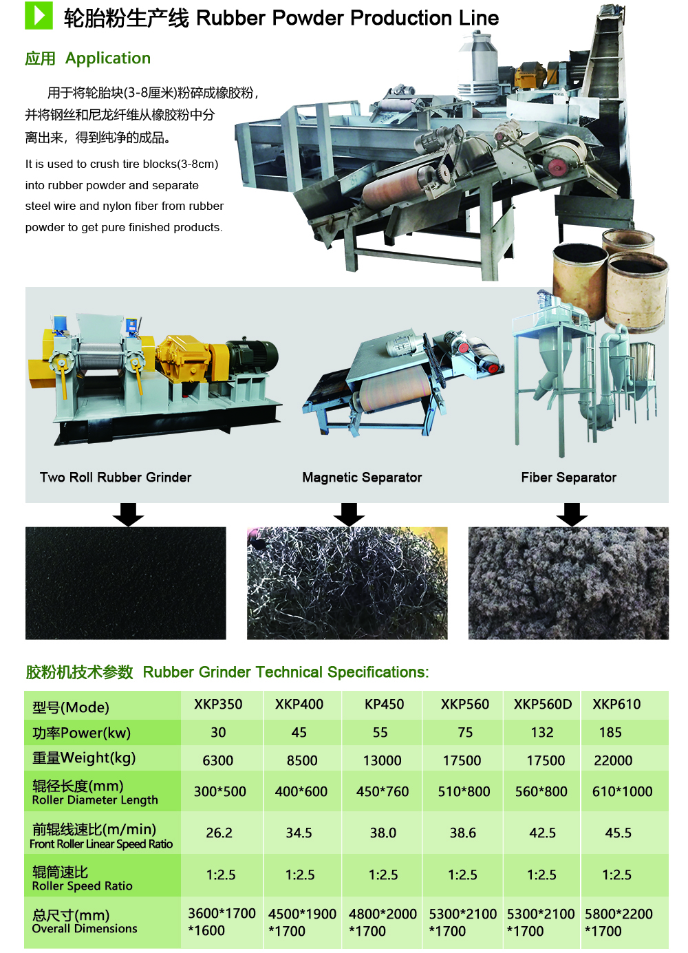 废旧轮胎胶粉设备是将废旧轮胎、废旧橡胶处理成(10-40)目之间,再配合精细胶粉机达到(40-100目)超精细橡胶粉,并一次性将轮胎内所含的三大原料:橡胶、钢丝、纤维分离。通过“橡胶还原剂”可将废旧橡胶还原至末硫化之前的状态,制作各类橡胶制品,以达到废物循环再利用。