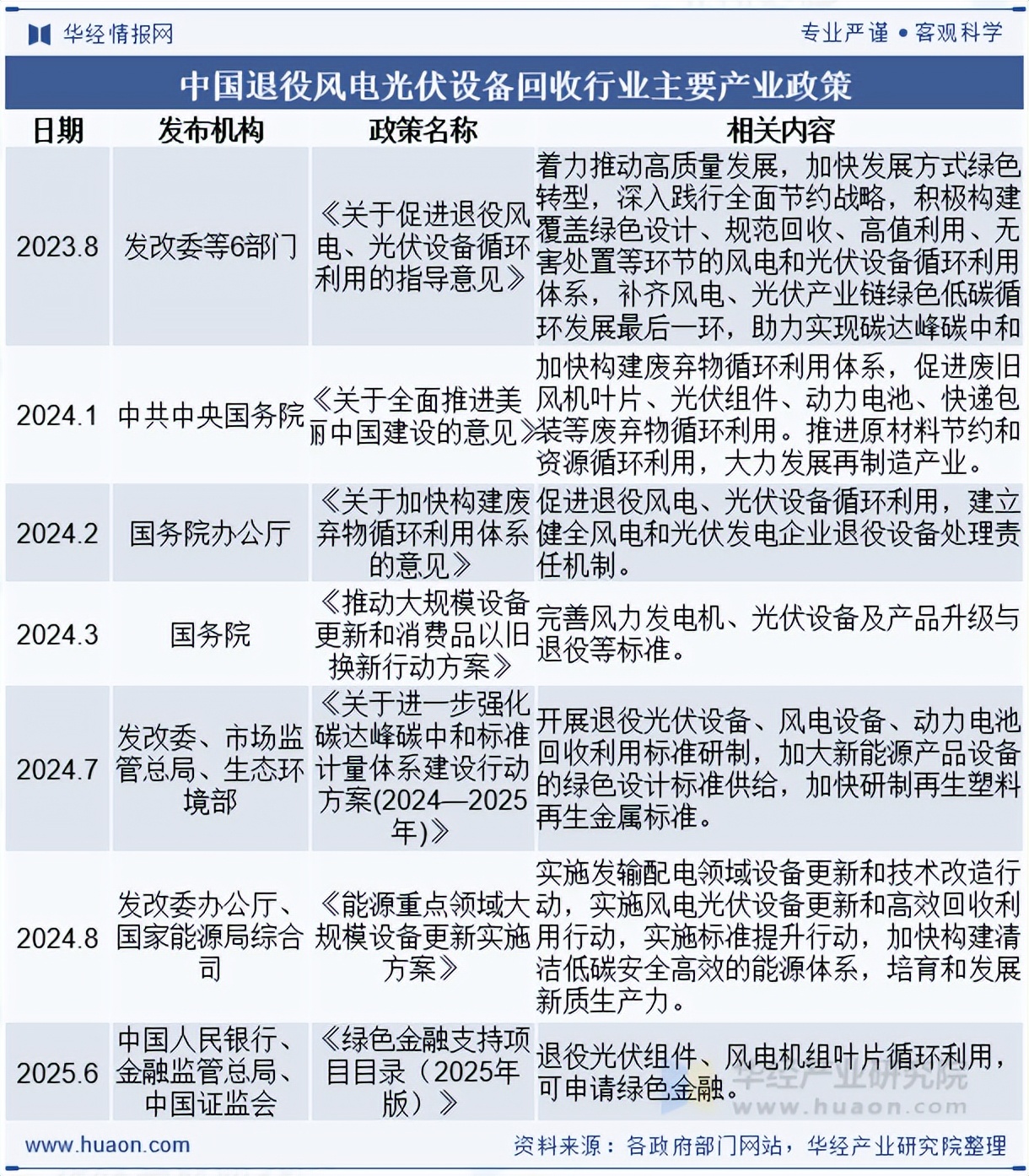 本文节选自华经产业研究院发布的《2025年中国退役风电光伏设备回收行业发展现状分析:体系日趋完善,市场前景广阔「图」》,如需获取全文内容,可进入华经情报网搜索查看。