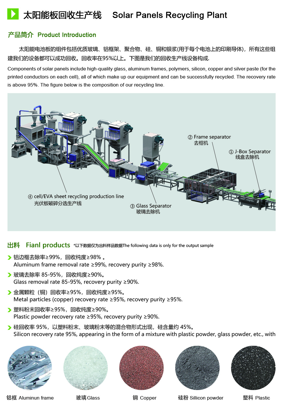 正常情况下,一批太阳能光伏板的使用寿命约为25年。随着新兴技术的发展和产品的快速变化,到2025年第一批光伏板可能报废,到2050年将产品红957万吨报废太阳能板,因此回收废旧光伏板将吸引越来越多的关注。太阳能板中玻璃、铝、黏合封胶、硅、银等的组分含量高,另外还有镉、镓等稀有金属,具有非好的资源化利用价值。设备通过自动拆解、破碎、分选等物理途径回收废弃光伏面板,从而达到回收有用组分的目的。